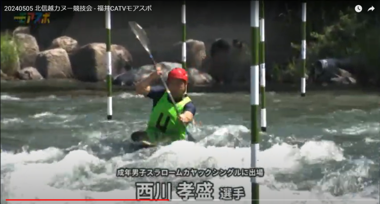 2024年5月5日(Sun)、福井県福井市足羽川のカヌー競技場にて、北信越5県の代表選手が集まり開催された第45回北信越国民スポーツ大会に福井県代表として出場した西川選手は、3位入賞を果たしましたが、上位2枠に入れず佐賀国スポへの出場は果たせませんでした。水量が少なく、経験より漕力が問われた20ゲートを攻略できませんでした。