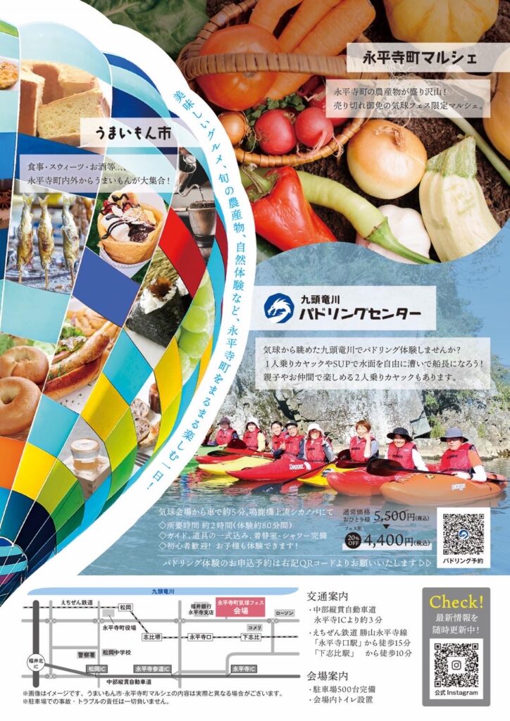 2024/10/6(Sun)に永平寺町の九頭竜川河川公園にて、気球に乗れるイベントが開催されます。気球から眺めた九頭竜川で、パドリング体験しませんか?