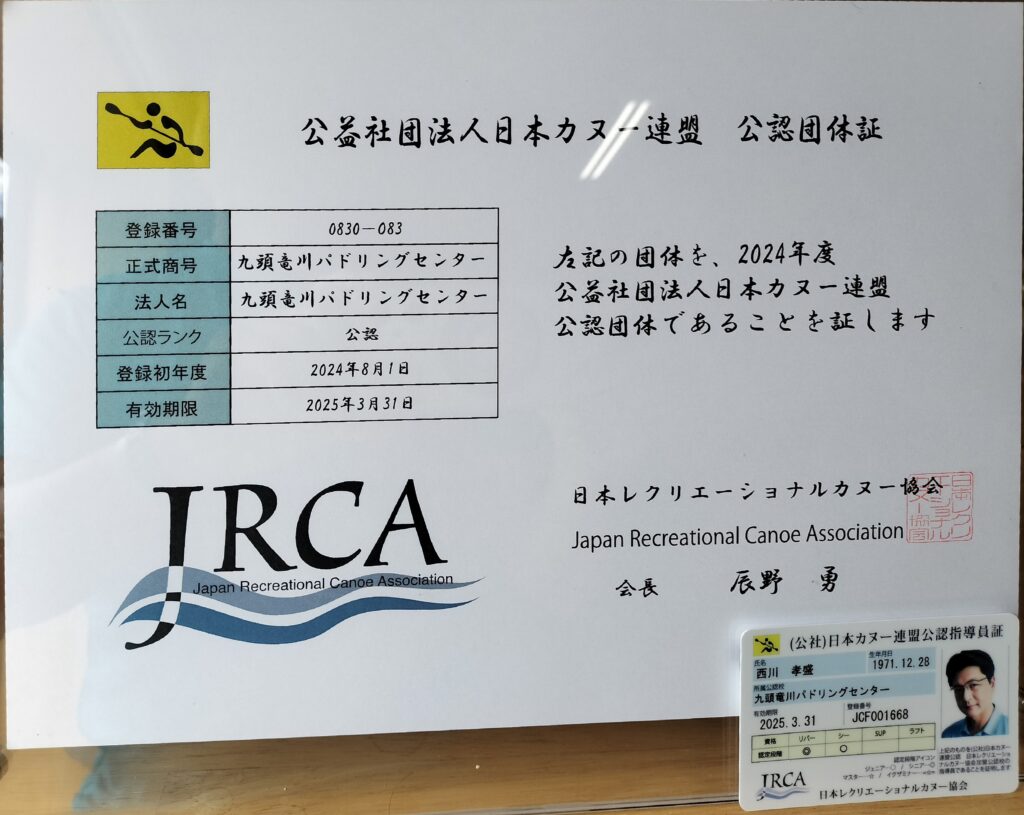 当センターは、日本レクリエーショナルカヌー協会(JRCA)の公認スクールに認定されました。