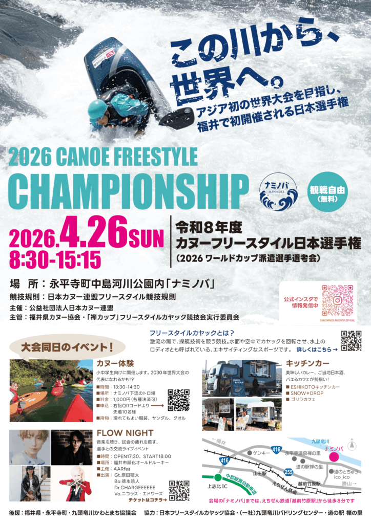 主管:福井県カヌー協会、「禅カップ」フリースタイルカヤック競技会実行委員会