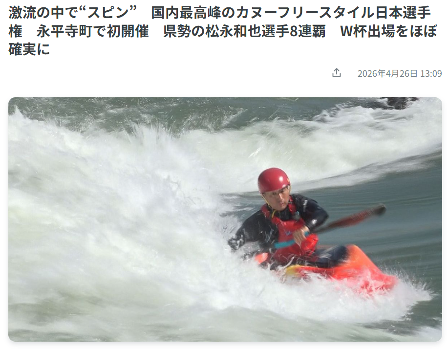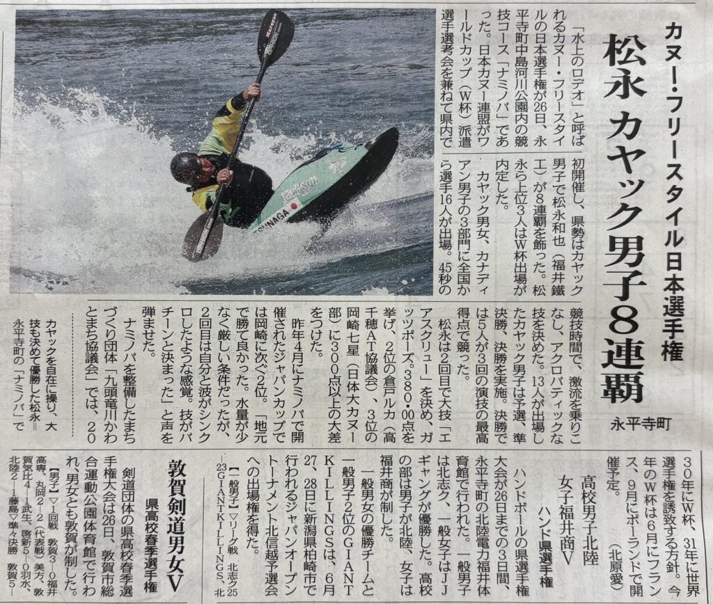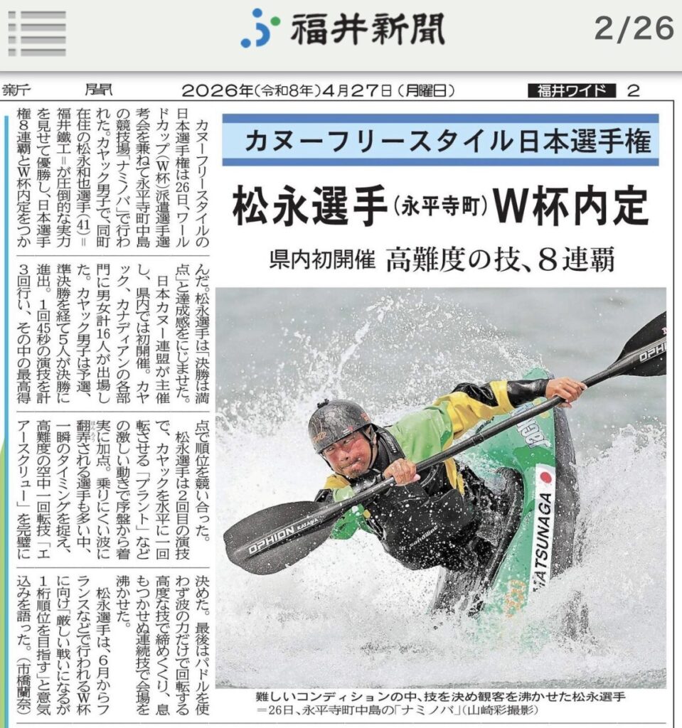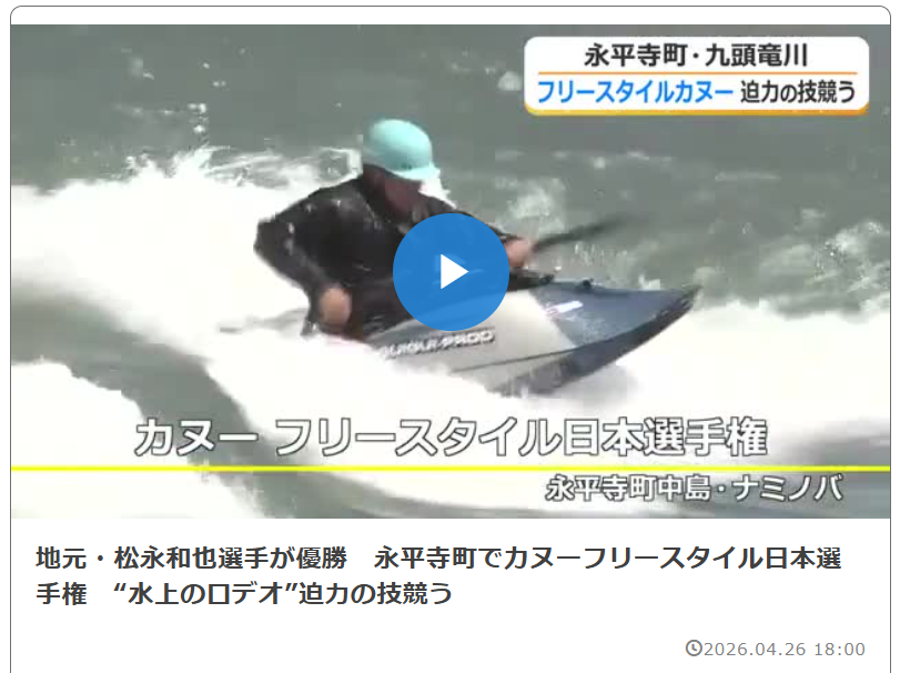 2026年4月26日、福井県永平寺町ナミノバでカヌーフリースタイル日本選手権を開催しました。お天気に恵まれ、多くのお客様のご来場ありがとうございました。
